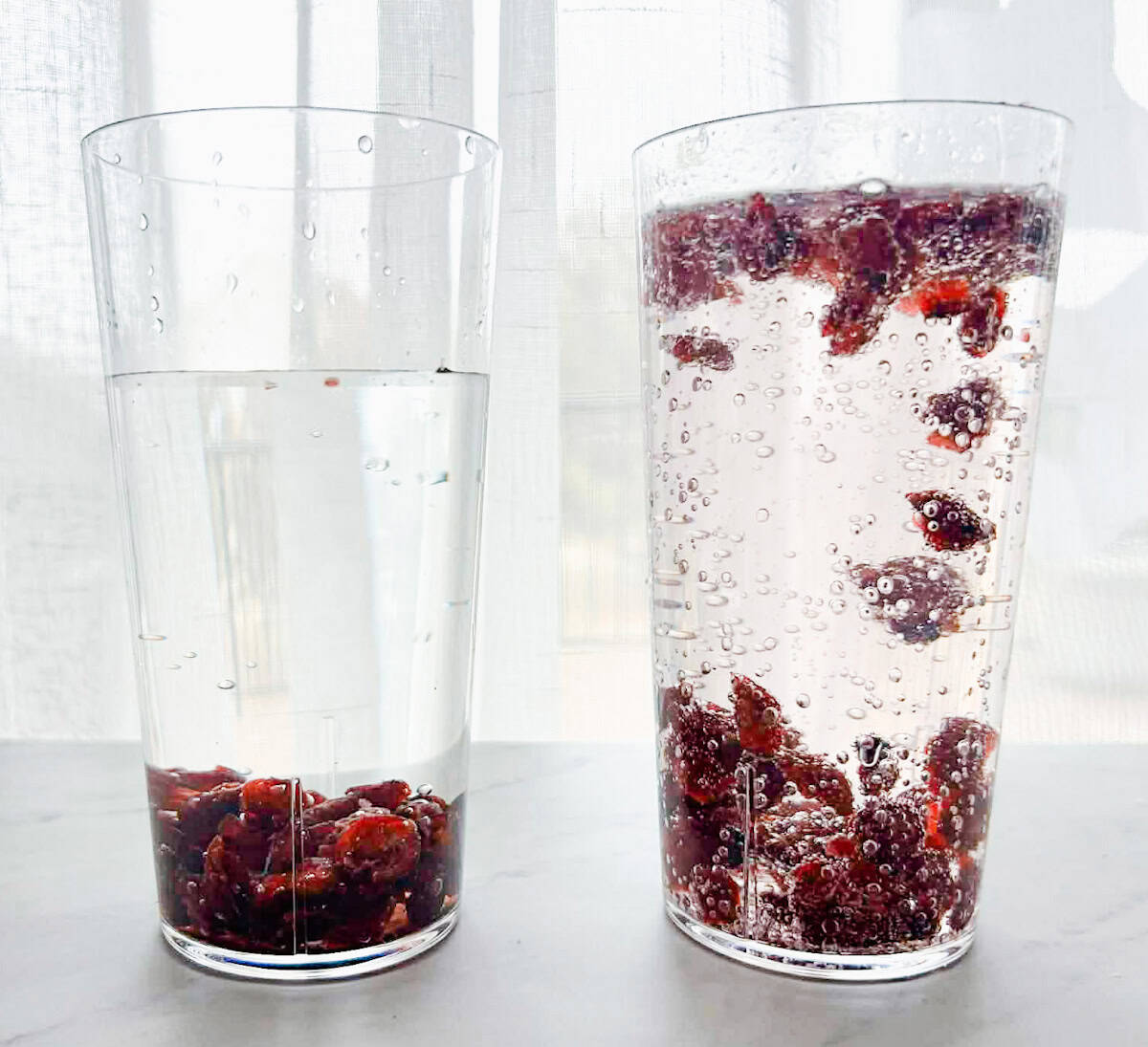 We tried this dancing raisin science activity with one glass of water and one glass of 7-Up to compare the results and add an extra learning element. My kids even snuck a few craisins as a snack while we watched the experiment, which made it even more fun!