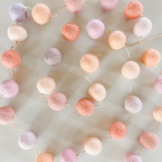There are different sized wool balls, the ones I used were 2 cm or .8 inches. I decided to leave a space in between my balls, and I used 35 balls, and ended with a 5ft garland. If you decide to not leave a gap you will need more felt balls. You will also need more if you decide to use smaller size of felt balls.