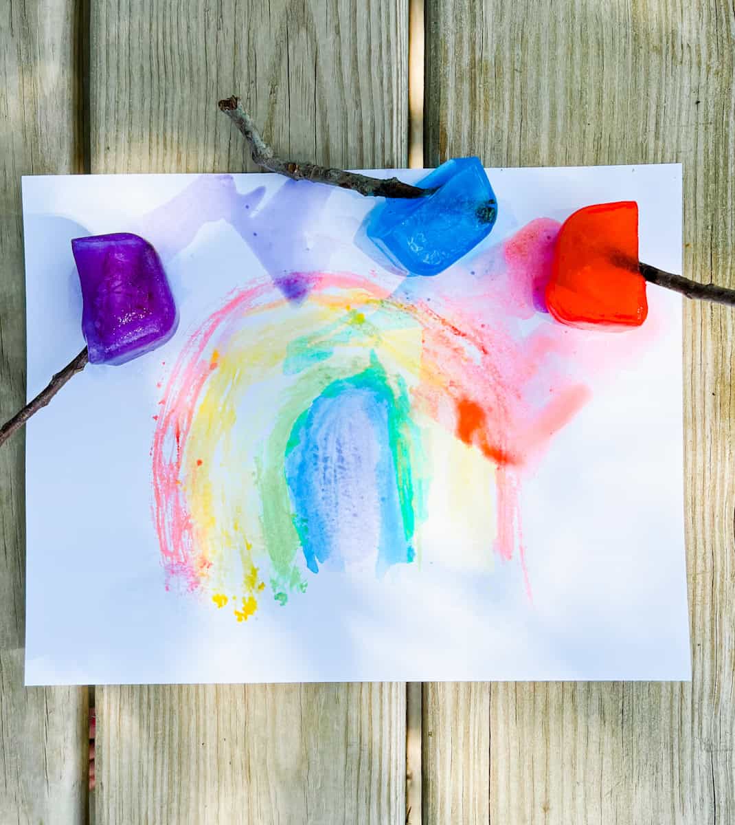 We didn’t have popsicle sticks, so we opted for some small sticks we found in the yard and they worked well! I loved doing this on a hot summer day so the ice could melt on the paper and we could take everything outside. It would also work as an indoor craft as well if it’s a rainy day or just too hot to be outside.