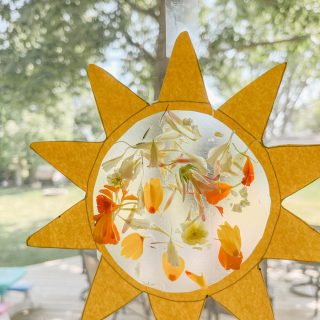 This sun suncatcher craft is an easy craft for kids that looks bright and cheery in your window or doorway. When I was thinking of a sun craft I could make with my daughters to celebrate the summer solstice I felt like a flower suncatcher was a pretty great way to say hello to summertime!