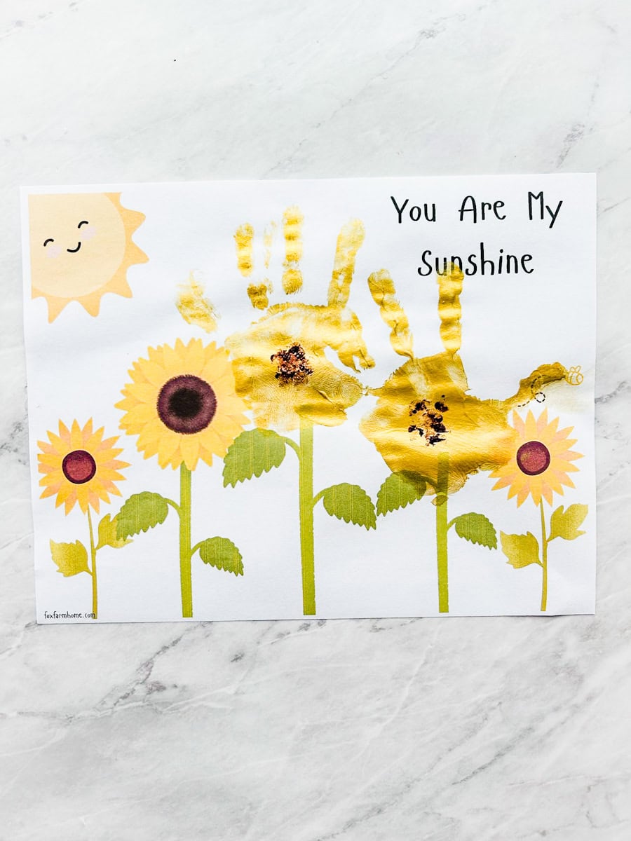 All you need to do is complete the information above and this free template will be emailed to you immediately. The printable template has 2 spots for a child’s handprint (to create sweet sunflowers) and has the saying “You Are My Sunshine” on the top of it.